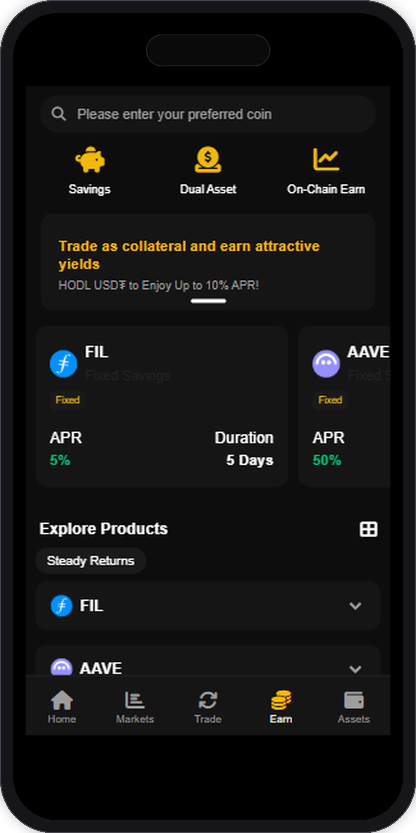 Earn lets you put idle crypto to work through curated yield options—flexible savings for daily interest and instant redemptions, fixed-term vaults for higher APRs, and advanced products like Dual Asset and on-chain staking for boosted returns.